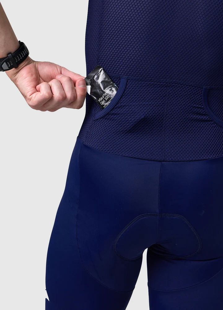 Bộ đồ còn có khóa kéo toàn thân YKK cao cấp và túi sau khí động học. Khóa kéo giúp bạn dễ mặc và cởi, đồng thời có thể mở nhanh để hạ nhiệt ở chặng chạy. Phía sau lưng là hai túi nhỏ được bố trí hợp lý, vừa đủ để mang gel năng lượng hoặc viên điện giải, mà vẫn đảm bảo tư thế khí động học ổn định.