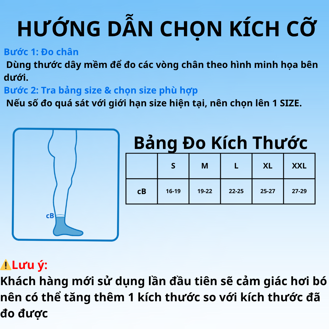 Kích cỡ: Có các size S, M, L, XL, XXL – phù hợp cho chu vi cổ chân từ ~16 cm đến ~29 cm