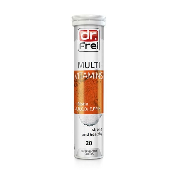 Trong 1 viên bổ sủi bọt Dr. Frei Multi Vitamins + Biotin chứa chủ yếu là các Vitamin tổng hợp (A, B2, C, D3, E, H) và được bổ sung thêm Biotin. Sự kết hợp các vitamin này giúp cân bằng quá trình trao đổi chất, củng cố cơ thể, tham gia điều hòa nhiều quá trình sinh hóa, giúp ngừa chứng hạ đường huyết và vitamin, đặc biệt là khi thiếu vitamin theo mùa và trong tình trạng căng thẳng về thể chất và tinh thần. Giúp duy trì hiệu suất tối ưu và giảm mệt mỏi.